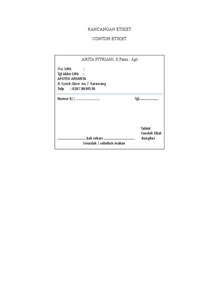 Etiket putih adalah etiket yang digunakan untuk obat yang masuk dalam saluran pencernaan etiket biru adalah etiket yang digunakan untuk obat yang tidak masuk dalam saluran pencernaan etiket putih contoh format etiket putih bagian bagiannya terdiri dari. Namun kedua duanya memiliki perbedaan. Namun untuk lebih jelasnya lagi berikut adalah contoh dari etiket komunikasi.